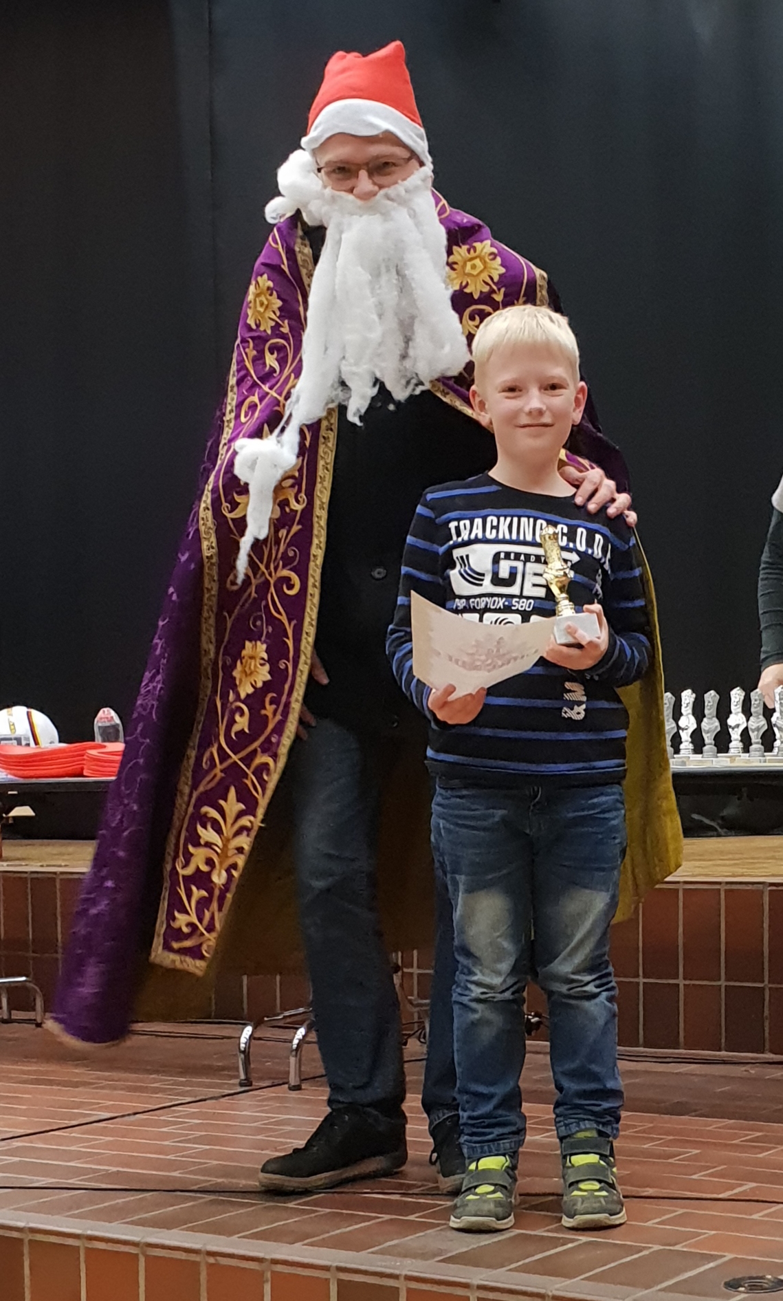 Während Schmidt am Vormittag drei von vier Runden gewinnen konnte, gelangen Selter sogar vier Siege, wodurch er das Teilnehmerfeld nun anführte. Nach der Mittagspause kassierte Selter allerdings seine erste Niederlage und fiel damit auf Rang zwei zurück. Nach einem Sieg in Runde sechs kam es in der letzten Begegnung des Tages nun zum Plettenberger Vereinsduell zwischen Selter und Schmidt. Die beiden U10 Mannschaftskollegen schenkten sich nichts und es gab Siegchancen auf beiden Seiten. Letztlich behielt aber Selter knapp die Oberhand und konnte das Spiel für sich entscheiden. Da der bis dahin auf Platz eins liegende Kontrahent aus Paderborn zeitgleich sein Spiel verlor, konnte sich Selter durch seinen Sieg und die bessere Feinwertung am Ende des Tages doch noch über den Turniersieg freuen. Von den fünf topgesetzten Spielern im Turnier konnte Selter vier bezwingen und gewann das Turnier somit völlig verdient. Passend zur Vorweihnachtszeit überreichte der Nikolaus persönlich den Siegerpokal.